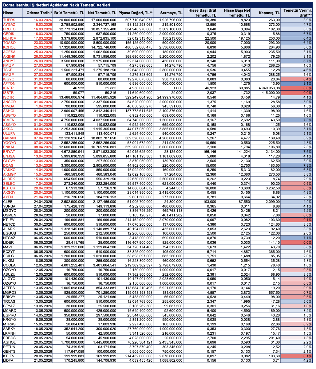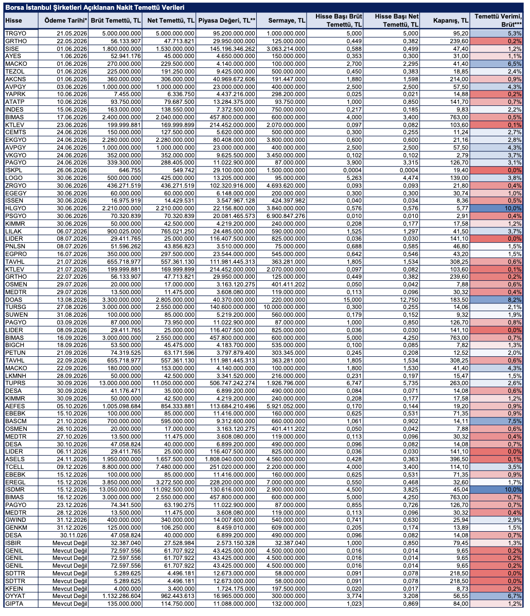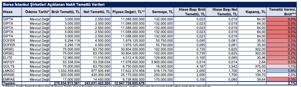BMD Araştırma'nın analizine göre, 2025 yılı karından temettü dağıtımına dair yönetim kurulu kararı almış BİST şirketlerinin dağıtmayı planladığı nakit temettü tutarı, temettü dağıtım tarihi ve temettü verileri şu şekilde: